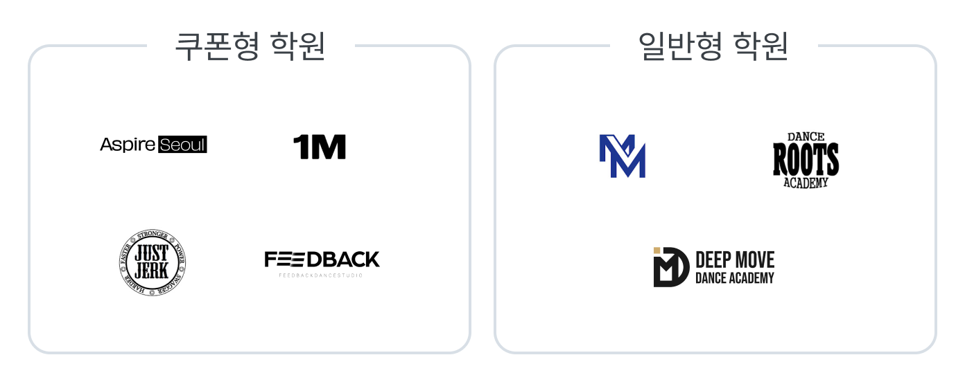 쿠폰형 학원의 경우에는 1회 권, 4회 권 등의 수강권을 발행하며, 학원은 매달 수업 시간표를 공지하고 수강생은 원하는 강사의 수업을 예약하는 형태로 이뤄집니다. 요가나 필라테스의 횟수권과 유사합니다. 대표적인 쿠폰형 학원은 에스파이어 서울, 원밀리언 댄스 스튜디오, 저스트절크, 피드백 댄스 스튜디오가 있습니다.