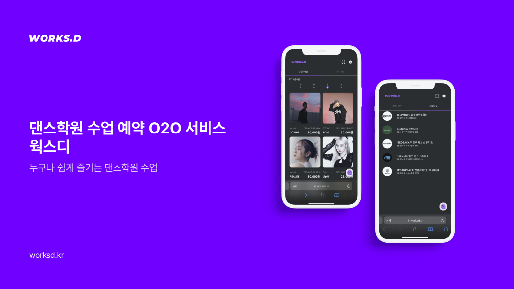 우리는 이러한 페인 포인트를 해결하기 위해서, 댄스 학원 수업 예약 O2O** 플랫폼 웍스디를 개발하게 되었습니다. 웍스디를 통해 (1) 정보 비대칭성 해결 (2) 수업 예약 절차 간소화 등을 목표로 삼았습니다.