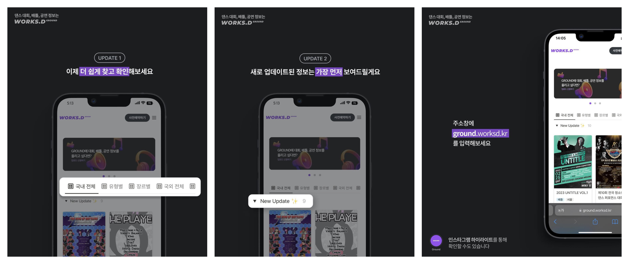 라는 질문에 우리가 가장 많은 답변을 받았던 것은 댄스 배틀이나 공연들의 정보를 확인할 수 있는 서비스였습니다. 댄스 배틀이나 공연들이 지인들 위주로 홍보가 되다 보니 외부의 유입이 부족했고, 이는 참여자는 물론 운영자도 불편함을 겪고 있었던 부분이었습니다.